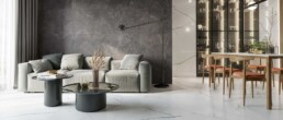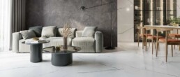 Colección inspirada en el bello mármol Carrara, con un fondo muy blanco y sus vetas irregulares más oscuras otorgándole profundidad y realismo a la colección.
