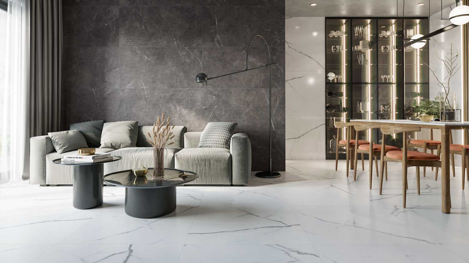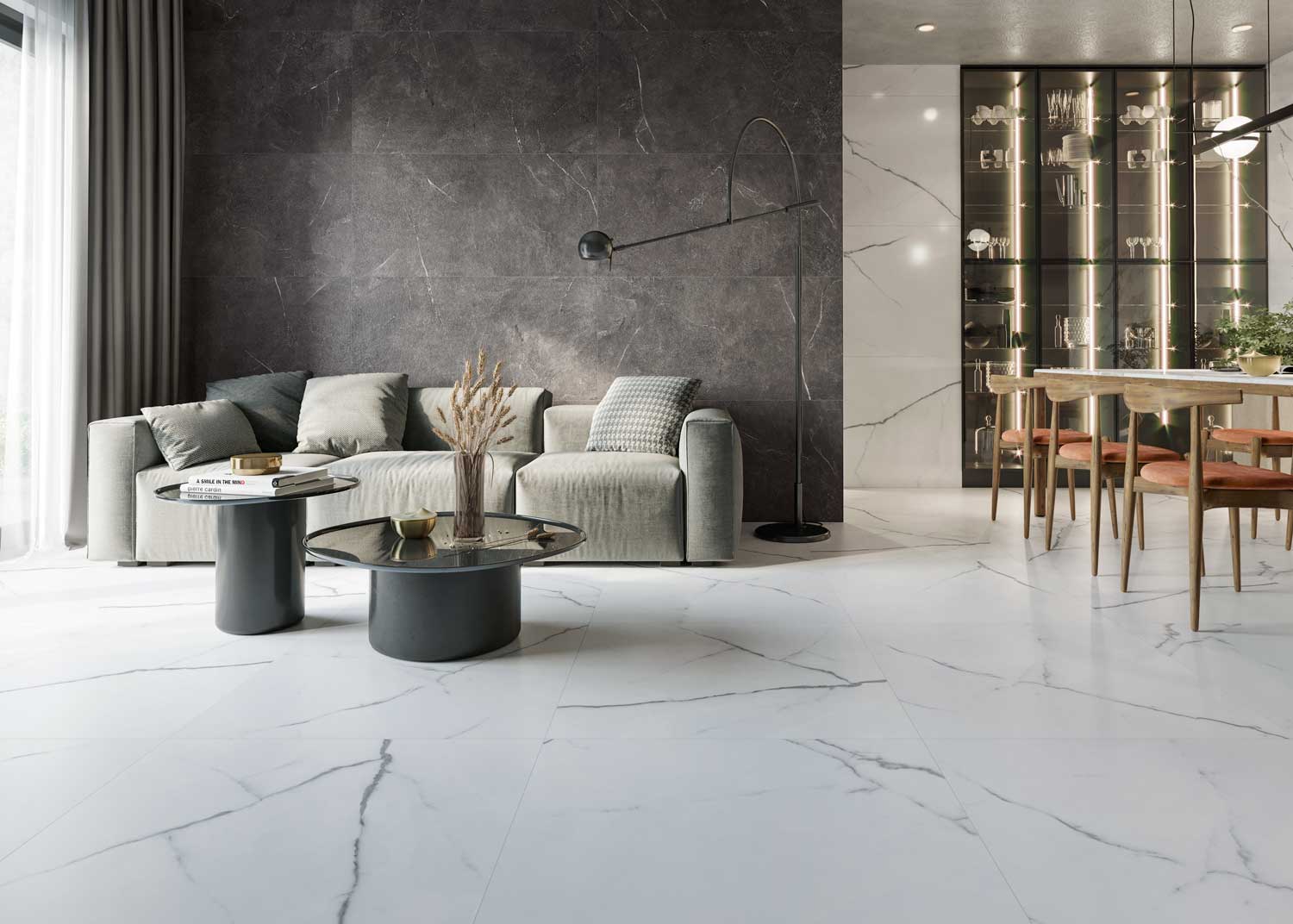 Colección inspirada en el bello mármol Carrara, con un fondo muy blanco y sus vetas irregulares más oscuras otorgándole profundidad y realismo a la colección.